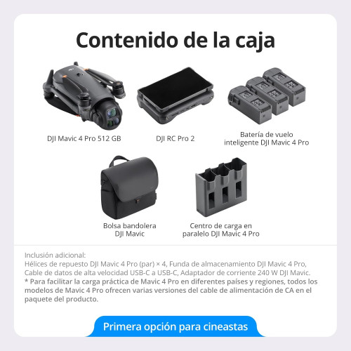 Componentes incluidos | DJI RC Pro 2 x 1, Batería de vuelo inteligente DJI Mavic 4 Pro x 3, Centro de carga en paralelo DJI Mavic 4 Pro x 1, Adaptador de corriente 240 W DJI Mavic x 1, Hélices de repuesto DJI Mavic 4 Pro (par) x 4, Cable de datos de alta velocidad USB-C a USB-C x 1, Bolsa bandolera DJI Mavic x 1, DJI Mavic 4 Pro 512 GB x 1, Funda de almacenamiento DJI Mavic 4 Pro x 1 Ver más |