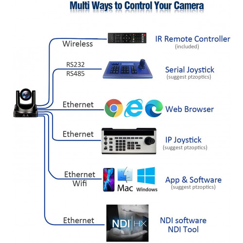 • Conexiones de vídeo: HDMI, 3G-SDI y transmisión IP, RS232 y RS485 (serial), IP (LAN/WAN) y control NDI|HX. Compatible con POE