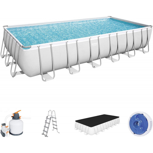 - Contenido del envío: piscina de pie Bestway Power Steel, incluye filtro de arena, escalera de seguridad, lona protectora, dosificador químico y parches de reparación autoadhesivos, material: TriTech, dimensiones: 732 x 366 x 132 cm, color gris