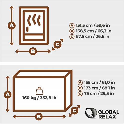 • CALIDAD EUROPEA: Vendido por Global Relax España – La sauna DHARANI S1 PLUS está cubierta por una GARANTÍA OFICIAL de 2 AÑOS – Opcional: Ampliación de GARANTÍA PLUS 5 AÑOS (2+3 Años) - Manual de Instrucciones en español – Medidas Sauna: 168 * 68 * 150 cm, peso 135 kg.
