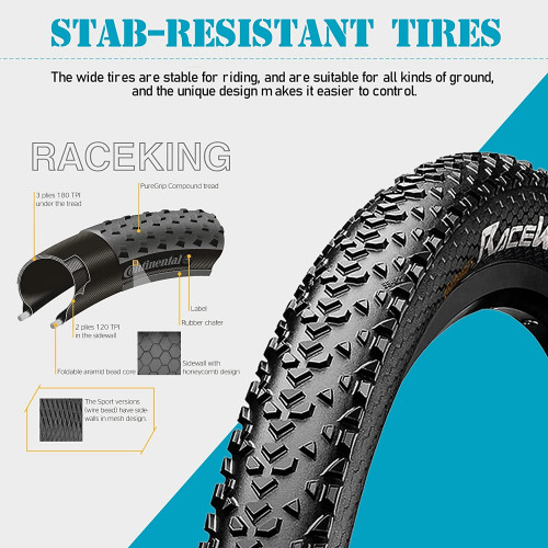 - Sistema Freno de Disco Hidráulico y Continental Tire: los frenos de disco mecánicos dobles proporcionan una excelente potencia de frenado en caso de emergencia. El neumático Continental Mountain Bike ofrece un excelente rendimiento en múltiples condiciones.