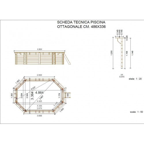 Piscina fabricada en pino impregnado en autoclave, clase 4. Modo constructivo blockhouse. Grosor de las tablas: 4,5 cm. Completo: Liner 75/100, fieltro y perfil de fijación Liner Escalera de madera exterior Escalera de acero interior Sistema de filtración de arena 4 mc/h Skimmer Tubo flexible de conexión Dimensiones 486 x 336 cm Altura exterior 120 cm Altura interior 116 cm Dimensiones embalaje 310 x 120 x 54 cm Peso bruto Embalaje 70 kg 0.