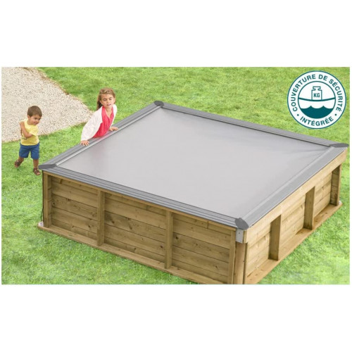 Piscina de exterior NaturalWood Pistoche construida con madera nórdica tratada en autoclave clase III y IV, con todo lo necesario para la ponerla en funcionamiento y uso. Práctica, solida y bonita, esta piscina está construida a medida para niños y la altura del agua es ajustable. Además, tiene integrada una cubierta de seguridad.