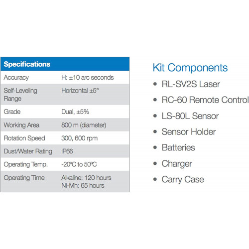 - Fácil de usar: Con electrónica autonivelante, pulsa el botón de encendido e ir derecho a trabajar en cuestión de segundos. Si el RL-SV2S se perturba en el trabajo que relevels automáticamente. Los motores autonivelantes son exactos a  ± 10 segundos de arco en ambos ejes.