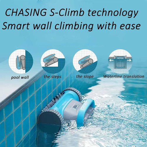 • *[Persiguiendo la tecnología S-CLIMB, la escalada inteligente de la pared]: El limpiador automático de piscinas de robots, con la tecnología S-Climb, puede identificar automáticamente las paredes de la piscina, los pasos, las pendientes, etc., darse cuenta fácilmente de la función de escalada de paredes y continuar limpiando el trabajo.En el modo de línea de flotación, puede reflejar mejor su capacidad de escalada de pared y su capacidad de limpieza eficiente en el estado vertical.Inteligente y