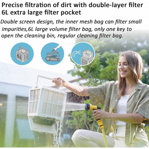 • *[Filtro extraíble, filtración precisa]: El limpiador de piscinas está diseñado con un filtro ultra fino desmontable, que no solo puede filtrar arena, hojas, piedras y otras impurezas granulares, sino también de lodo de filtro, caspa, grasa y otros finosimpurezas impurezas.6L Bolsa de filtro de capacidad ultra grande, sin temor a llenarse.Para los escombros almacenados en la bolsa del filtro, solo es necesario abrir la cámara de limpieza regularmente para limpiar la bolsa del filtro.¡La limpieza