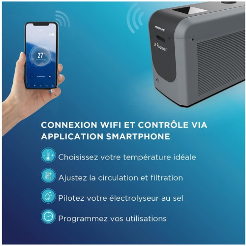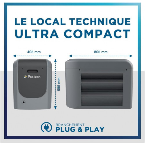 Bomba de calor centralizada y conectada Poolican Poolex para piscina 25m3. Los 4 indispensables para su piscina en una sola solución. Bomba de circulación para filtración, tratamiento de electrólisis, y bomba de calor para calefacción inverter. Poolican Poolex es una solución 4 en 1. Poolican Poolex es un equipo compacto que se coloca cerca de la piscina y se conecta a una toma de corriente. En el interior encontramos una bomba de circulación, un filtro de cartucho, un electrólico de sal y una bomba de calor inversor completo de 5 kW adecuada para una piscina de hasta 25 m3. El Poolican, es un dispositivo intuitivo, que reúne los tres elementos indispensables para una piscina de hasta 25m3. Y va aún más allá con un 4to elemento que garantiza la comodidad de los bañistas con agua siempre a buena temperatura. Instalación fácil y rápida El kit UConnect se instala junto a la piscina en cuestión de minutos. No es necesario fijarlo y se puede quitar en cualquier momento. Viene con una manguera de succión y una manguera de descarga, para conectar a la entrada y salida de agua de la bomba de calor. El transformador eléctrico 230 - 12 V es alimentado directamente por la bomba de calor, lo que facilita la instalación. Opta por el Poolican Poolex 4 soluciones en 1, uso centralizado y conectado para piscina de hasta 25m3: Circulación Filtración Calefacción Tratamiento Simple y eficiente: El Poco olican Poolex es un dispositivo intuitivo y reúne los tres esenciales para una piscina saludable. Y va aún más allá con un 4º elemento que garantiza la comodidad de los bañistas con agua siempre a la temperatura adecuada: la bomba de calor Poolican Poolex es un equipo compacto que se coloca cerca de la piscina y se conecta a una toma de corriente.