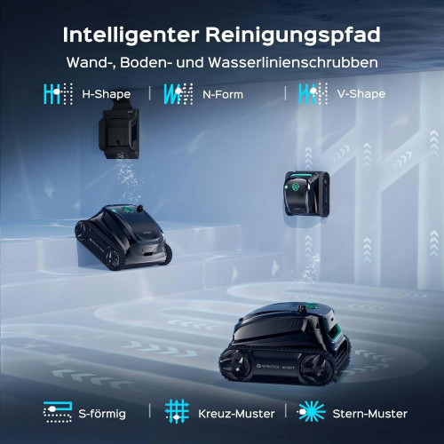 - 7 modos de limpieza y control de aplicación inteligente: con 7 modos de limpieza profesional y 6 rutas de navegación inteligentes para una cobertura completa de la piscina (paredes, suelo, línea de flotación). Limpieza individual, específica o completa por aplicación en una superficie de 300 m²: la solución ideal para piscinas privadas y medianas