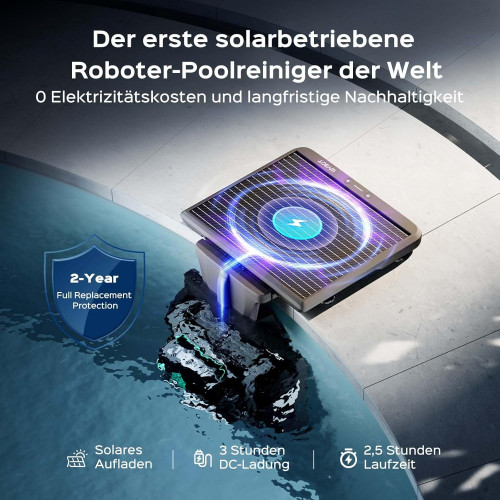 - Doble carga: el primer robot de limpieza de piscinas con energía solar del mundo, tiene dos opciones de carga: (1) carga solar ecológica o (2) carga de respaldo de CC rápida con poca luz solar.