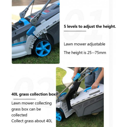 Ancho de corte: 370 mm Altura de corte: 25-75 mm Caja de césped grande: 40L Velocidad del motor: 3700 RPM Peso de la máquina: 15Kg Tiempo de carga: aproximadamente 2 horas tiempo de uso: 40V 0ah aproximadamente 20 minutos 40V 0ah aproximadamente 45 minutos Marca | FDGSD |