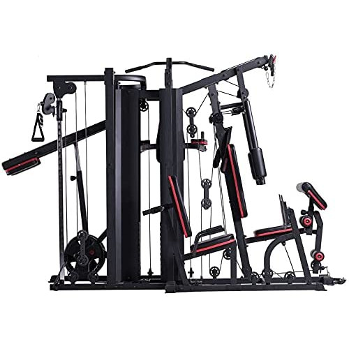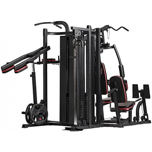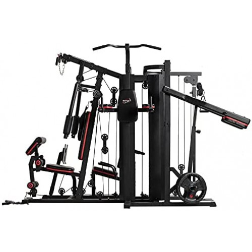 - Tiene 2 columnas con paquetes de 105 kg cada una para poder usar el gimnasio con 2 usuarios juntos, 105 kg son para el cuerpo frontal mientras que la segunda columna conectada a la prensa y a la hercolina regulable en altura con 25 posiciones. Hay una máquina de calf que se puede utilizar también como máquina de sentadillas. Los discos para la máquina de calf no están incluidos, son compatibles de 50 y 25 mm.