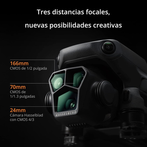 - Telecámara intermedia - El dron con cámara Mavic 3 Pro tiene un sensor CMOS de 1/1.3 pulgadas equivalente a 70 mm, zoom óptico 3×, f/2.8, 48 MP; telecámara con CMOS de 1/2 pulgada equivalente a 166 mm, zoom óptico 7×, zoom híbrido 28×, f/3.4, 12 MP.