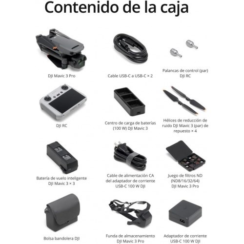 Componentes incluidos | DJI Mavic 3 Pro x1; DJI RC x1; Palancas de control (par) DJI RC x1; Batería de vuelo inteligente DJI Mavic 3 x3; Hélices de reducción de ruido DJI Mavic 3 (par) de repuesto x4; Cable de alimentación CA del adaptador de corriente USB-C 100 W DJI x1; Adaptador de corriente USB-C 100 W DJI x1; Cable USB-C a USB-C x2; Centro de carga de baterías (100 W) DJI Mavic 3 x1; Funda de almacenamiento DJI Mavic 3 Pro x1; Juego de filtros ND (ND8/16/32/64) DJI Mavic 3 Pro x1; Bolsa bandolera DJI x1 |