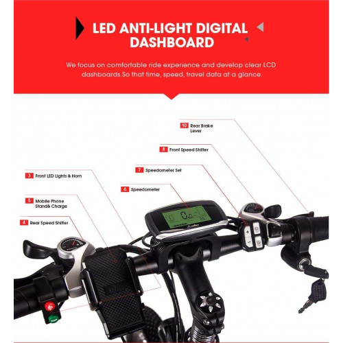 - Tres modos de ciclismo: modo eléctrico completo: el manillar derecho tiene el acelerador. Puedes conducir fácilmente el modo de asistencia de pedal de bicicleta eléctrica: puedes ahorrar un 70% de tu modo de apagado sin esfuerzo: como una bicicleta, debes hacer la bicicleta pedalando hacia adelante