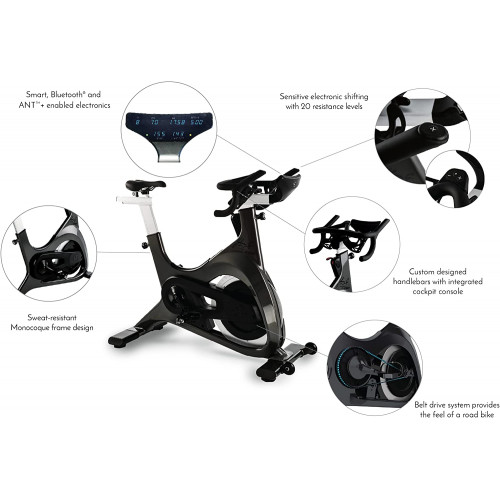 - Conectada. Tecnología inteligente Bluetooth y ANT + con conectividad con Garmin, MyZone, Zwift y Kinomap.