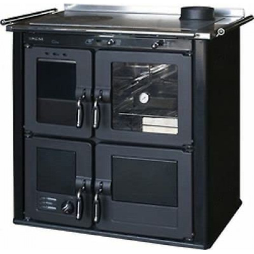 termocucina de leña con puerta fuego de hierro fundido, cristal focolare cerámico, cámara combustión en piedra, horno inoxidable, aire primaria ajustable, baúl, caderas en acero, aire secundaria y terziaria pretarate, posibilidad de desagüe posterior, paneles y Cappa opcionales, Kit aire comburente externa opz., Top Soporte Placa de hierro fundido esmaltado, termocamera de acero, sistema de seguridad integrado serpentino.