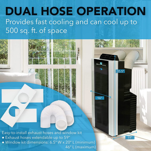 - Refrigerante verde R-32 sin CFC ecológico; manguera de escape extensible (hasta 60 pulgadas); dimensiones del kit de ventana: 6.5 pulgadas de ancho x 20 pulgadas de largo (mínimo), 46 pulgadas (máximo). Dimensiones de la unidad: 19 pulgadas de ancho x 16 pulgadas de profundidad x 35.5 pulgadas de alto