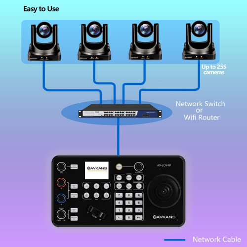 • La conexión IP Ethernet controla las cámaras PTZ de transmisión IP en tu LAN solo con un cable de red.