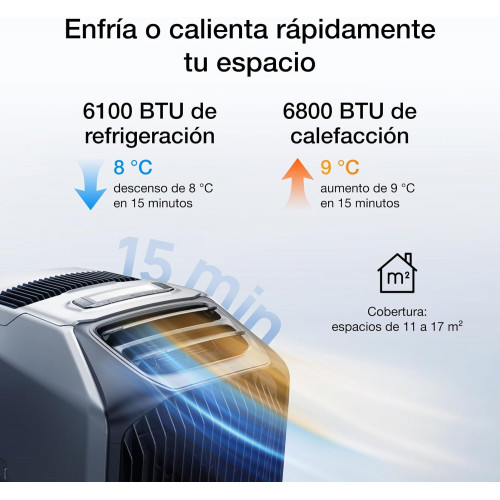 - Climatización rápida: El aire acondicionado portátil EcoFlow WAVE 3 ofrece 1800 W de refrigeración, un 20% más que sus competidores, para reducir las temperaturas a 8 °C en solo 15 minutos. Su calentamiento de 2000 W aumenta el calor en 9 °C, mientras que el modo automático mantiene una comodidad ideal día/noche en diferentes climas.
