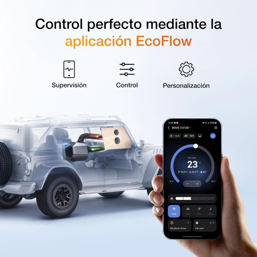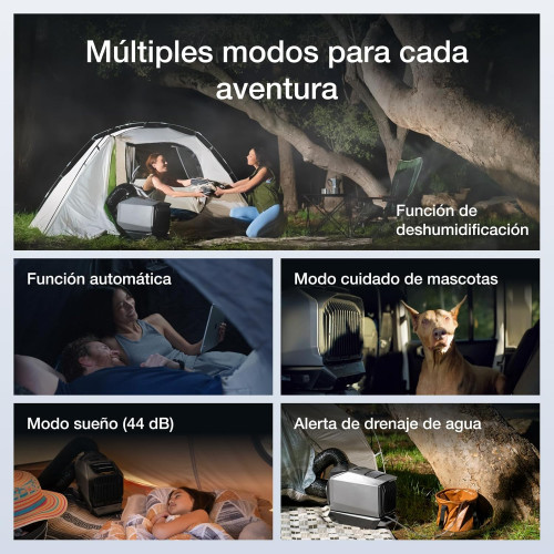 - Ecosistema inteligente: el aire acondicionado portátil EcoFlow WAVE 3 ofrece control avanzado a través de la aplicación para ajustes precisos de temperatura, modo y temporizador, con alertas de agua y potencia que garantizan un rendimiento óptimo. Su modo de espera de 44 dB y su función de cuidado de mascotas protegen automáticamente a las mascotas del sobrecalentamiento durante el viaje.