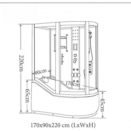 - ESPECIFICACIONES TECNICAS: Dimensiones de la bañera: base 170 x 90 x h 220 cm Toallero n 1 reposacabezas Sistema de ventilación Columna de ducha de hidromasaje n 9 LEDs