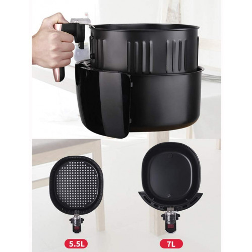 - 7L de gran capacidad, proporcionando suficiente espacio para hornear, asar y freír varios ingredientes, adecuado para uso familiar.