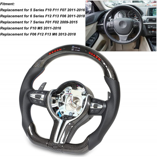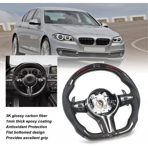 - 【CARACTERÍSTICAS】Volante mejorado, parte superior e inferior de fibra de carbono, cuero perforado a la izquierda y a la derecha, diseño de carrera D de fondo plano, indicador LED de carrera con indicador de cambio, costuras M‑tri, con bordes para los dedos.
