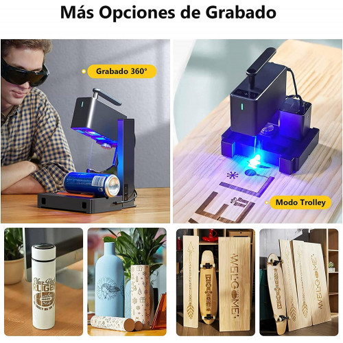 • Grabado giratorio de 360°: Utilizando el innovador tercer eje, la Cortadora Láser LaserPecker 2 puede realizar un grabado giratorio de 360° en objetos cilíndricos como botellas, lápices, etc. Con los modos de bandeja y carro, el tamaño de grabado aumenta significativamente hasta 100 x 2000 mm. Con el cómodo asa, puede aplicar láser fácilmente a cilindros, superficies grandes u objetos voluminosos, como troncos de árboles.