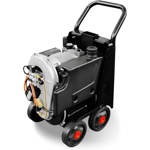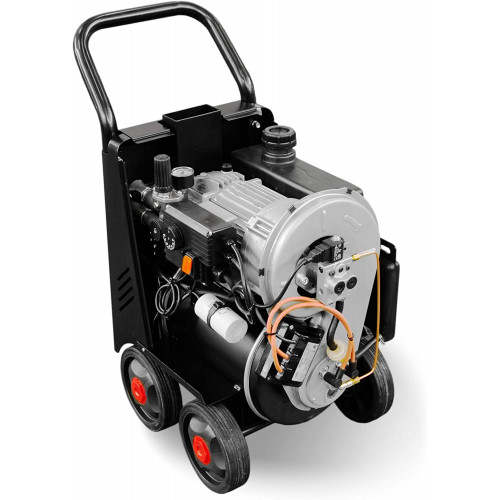 Hidrolimpiadora profesional de agua caliente. Estructura de acero barnizado. Fabricación hidromatic 100 % fabricada en Italia. Bomba de tres pistones en línea con sistema de manivela. Amperaje limitado. Accesorios profesionales italianos caldera horizontal de doble giro de humos.