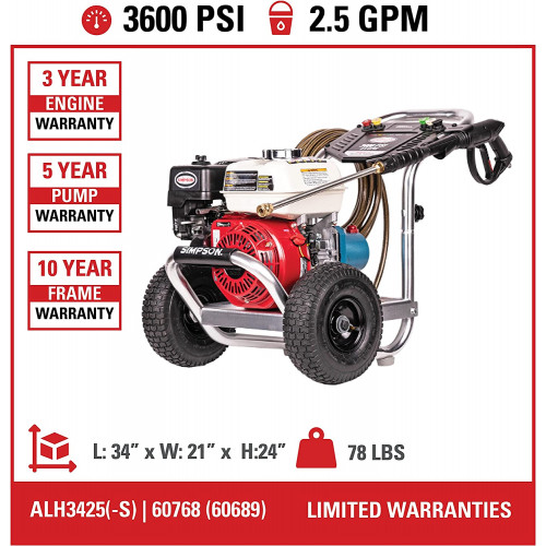 SIMPSON Cleaning Lavadora a presión de gas de aluminio ALH3425 alimentada por Honda GX200, 3600 PSI @ 2.5 GPM, negro y rojo