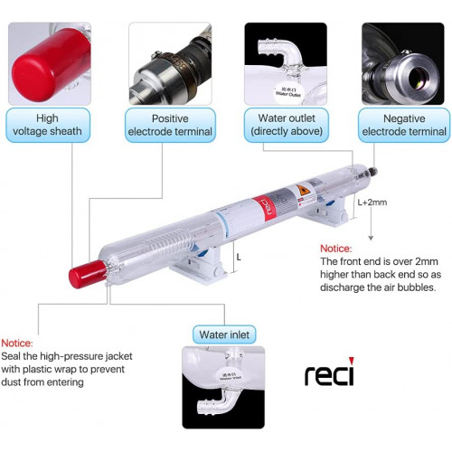 Tasa de potencia más alta en comparación con el tubo láser de longitud similar y mayor tiempo de servicio, que es adecuado para marcado láser, corte láser y grabado láser.