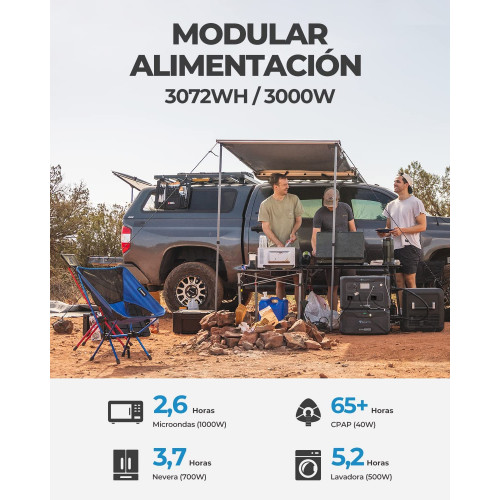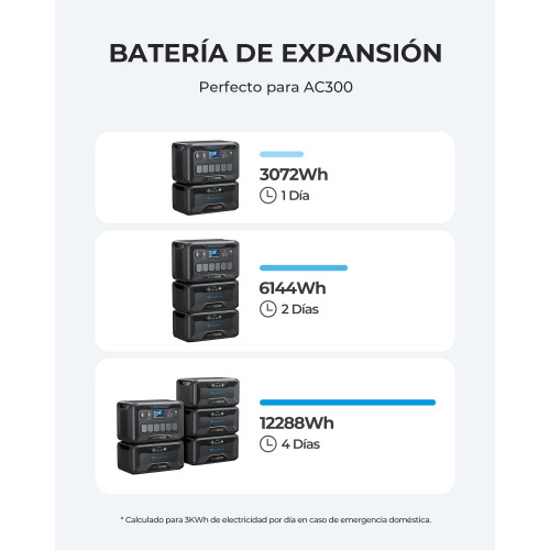 - [Amplíe el rendimiento] - Un AC300 con un inversor de 3000W conecta paquetes de baterías B300 LFP para aumentar su capacidad hasta 12288Wh. ¡Maneje todas sus necesidades de energía durante días durante cortes de energía!