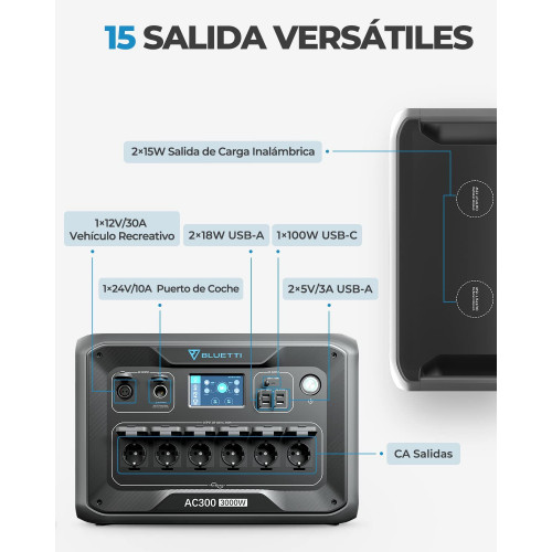 - [15 puertos versátiles] - El conector RV 30A para dispositivos alimentados por vehículo. Además, dispone de 3000 W AC/USB-A/100 W USB-C/cargador inalámbrico/conexión del coche.
