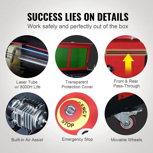 • Operación fácil y segura: La ventana de visualización transparente con protección ocular tintada le permite monitorear el progreso del grabado en cualquier momento y puede cortar automáticamente la energía cuando se abre. Una parada de emergencia está lista en caso de que algo salga mal. Nuestro grabador láser también tiene una asistencia de aire incorporada para eliminar todo el humo, el polvo y las chispas, y las ruedas móviles facilitan el movimiento.
