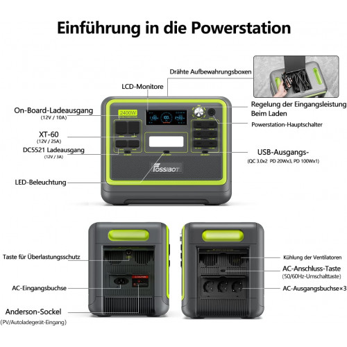 - Lo que obtienes: F2400 Lifepo4 Battery Power Station, 3 tipos de cable de carga (cable de carga CA, cable de carga de coche, cable de carga solar), instrucciones de uso, nuestra garantía de 2 años sin preocupaciones y amable servicio al cliente.