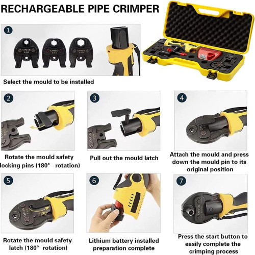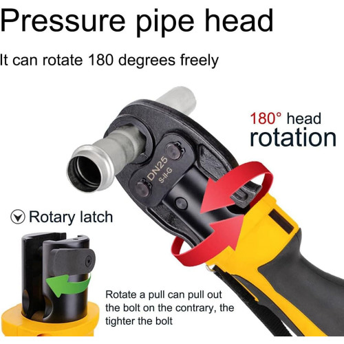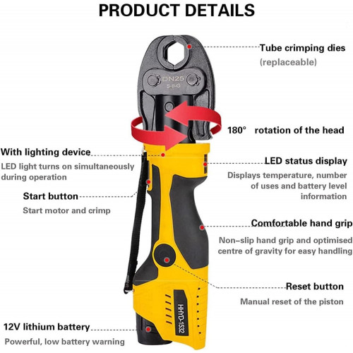 - 【Rendimiento potente】: el potente motor garantiza un engarzado rápido y eficiente de la manguera. Batería de Li-ion de alto rendimiento con gran capacidad y tiempos de carga cortos. El LED ilumina el área de trabajo para facilitar la operación en áreas oscuras. La función de retracción automática garantiza un funcionamiento preciso y seguro. Puedes usarlo con confianza.