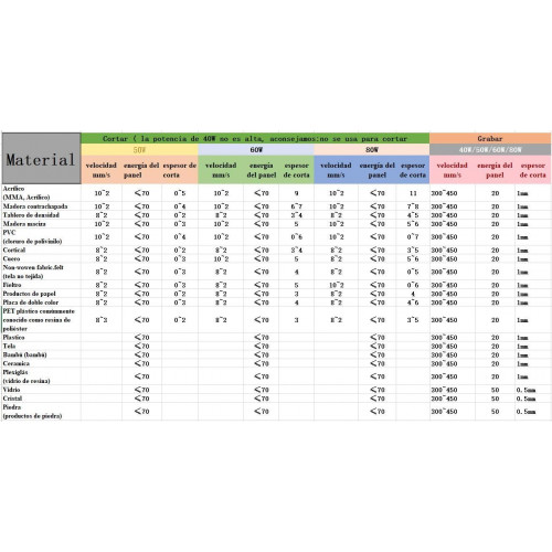 Velocidad de grabado: 0-500 mm / s ; Velocidad de corte: 0-30 mm / s