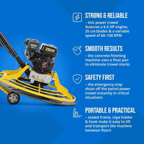 - Potente y fiable – esta allanadora de concreto cuenta con un motor de 6.5 HP, palas de 35 cm y velocidad ajustable de 60–100 rpm