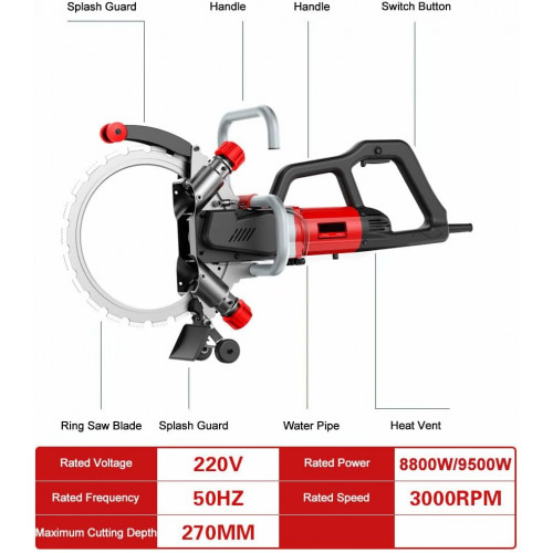 La sierra anular sin escobillas es una herramienta de corte de alto rendimiento diseñada para una amplia gama de materiales, incluyendo piedra, metal, acero inoxidable, mármol, granito, cerámica, vidrio, goma y espuma. Con un voltaje de 220 V y una potencia nominal de 8800 W/9500, ofrece un rendimiento de corte eficiente y potente. La sierra cuenta con un gran diámetro de hoja de sierra de 370 mm y una profundidad máxima de corte de 27 cm, por lo que es adecuada para tareas pesadas. Funciona a una velocidad nominal de 3000 r/min, asegurando cortes suaves y precisos cada vez. El paquete incluye una sierra de corte, lista para tu próximo proyecto. Esta herramienta es ideal para profesionales y entusiastas del bricolaje que buscan fiabilidad y versatilidad en sus tareas de corte.