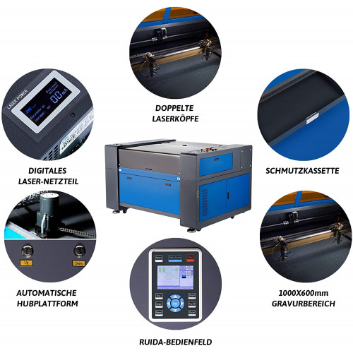 • DOBLE EFICIENCIA: Esta máquina de grabado láser de CO2 viene con dos tubos láser de 80 W y dos cabezales láser para realizar doble velocidad. Para sus proyectos por lotes, esta operación simultánea es exactamente lo que está buscando, especialmente porque esta cortadora láser cubre el área de trabajo de 1000 x 600 mm y nuestras puertas de paso para piezas aún más grandes.