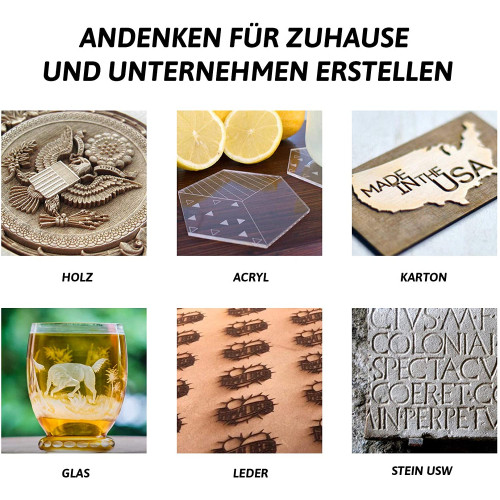 • APLICACIÓN AMPLIA: La máquina puede procesar los siguientes materiales: madera, caucho, acrílico, delrin, tela, cuero, papel, fibra de vidrio, plexiglás, azulejos, plástico, mármol, cartón, melamina, mylar, aglomerado, madera contrachapada, corcho, corian etc. ¡NO talle ni corte metal!