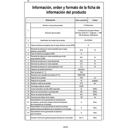 - TV de 42" (106cm) 4K OLED EVO Flexible (20 posiciones) con ajuste de altura. SmartTV WebOS 22 con Control por Voz Sin Mando, TV Always Ready, Asistente de Google Integrado, Asistente ALEXA Integrado, Funciona con Apple Home Kit, Airplay 2, Screen Share, Navegador Libre, WiFi (802.11ac), Magic Remote Incluido MR22. IMAGEN Y SONIDO: Procesador Inteligente α9 Gen5 AI Processor 4K, Modo Autogénero (SDR/HDR/Dolby HDR), Dynamic Tone Mapping Pro (Analiza por separado 5.184 Areas de cada Imagen) Pixel Dimming, 33 Millones de puntos de luz independientes, 100% Fidelidad de Color, 100% Volumen de Color, HDR Dolby Vision IQ, HDR 10 Pro, HLG Pro, HDR Effect, Modo Director (FILMMAKER), 4K/2K HFR 100fps (RF/HDMI/USB). Sonido DOLBY ATMOS, 40W (WF:20W, 10W Por Canal), 2.2 ch, AI Sound Pro (Sonido Virtual 7.1.2 Up-mix), Compatible: WiSA 2.1ch. FUNCIONES GAMING: nVidia G-Sync, AMD Freesync, VRR, ALLM (Modo automático de Baja Latencia), HDR HGiG, Cloud Gaming Stadia / GeForce. CONECTIVIDAD: Sint. Terrestre/Satélite/Cable DVB-T2/S2/C, 4XHDMI, 4XUSB 2.0, Salída Óptica, Bluetooth (V5.0). Eficiencia Energética: (W) en SDR y (W) en HDR.