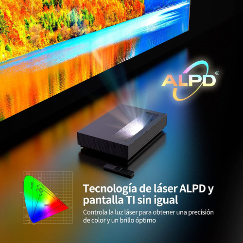 - PROYECTOR LÁSER 4K UHD - La resolución superior podría ser un eufemismo. Con 4K UHD y 2100 ANSI lúmenes brillantes (fuente de luz de 5000 lúmenes), obtendrá una resolución 4 veces superior a la de Full HD o 1080p. Nova está construido con la tecnología patentada ALPD 3.0 y TI DLP, líder en la industria. ALPD permite que la luz se utilice de forma más eficiente para obtener detalles más finos en una gama de colores más amplia y una vibración más profunda para una resolución de video impresionante. El proyector de alcance corto reduce la fatiga visual al difundir la luz sin perder calidad de imagen