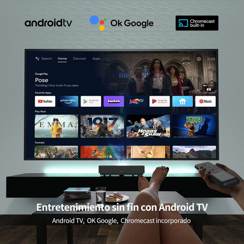 - PROYECTOR INTELIGENTE, APLICACIONES 5K INCORPORADAS - El Nova es un proyector inteligente que viene con miles de aplicaciones al alcance de su mano impulsadas por Android TV. Transmita sus programas favoritos de Hulu, HBO Max, Showtime, Disney+ y muchos más. Use el botón de comando de voz para decirle a Nova lo que quiere ver. NOTA: Se recomienda ver Netflix en Aptoide TV o con un dispositivo de streaming conectado como un Fire TV stick