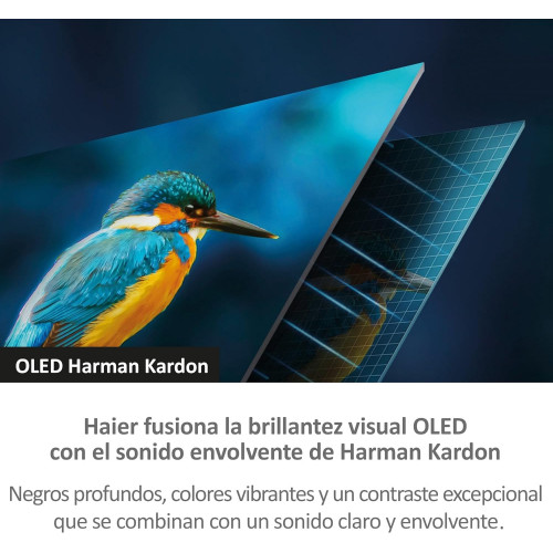 - El televisor Haier H55C900UX OLED 4K UHD de 55 pulgadas proporciona un optimo contraste y un negro más profundo para que brillen todos los colores, todo ello con la optima velocidad de panel a 120 Hz y una resolución 4K. Además, es un televisor Smart TV con Google TV que cuenta con Google Play para que no te pierdas ningún contenido de tus series y películas favoritas. Podrás utilizar tu televisión directamente con tu propia voz gracias a Google Assistant a través del micrófono integrado en el mando a distancia Smart Remote Control. Es una televisión que te permite conectar distintos dispositivos electrónicos, como cascos inalámbricos, gracias a la tecnología Bluetooth 5.1 y poder trasmitir información desde tu dispositivo móvil con cualquier aplicación compatible con Chromecast. La tecnología Dolby Vision y Dolby Atmos para una optima calidad de la imagen y un sonido envolvente respecto a un televisor convencional. Además, cuenta con un altavoz frontal con tecnología Harman Kardon que garantiza una calidad de sonido optimo, cada nota, cada detalle se reproduce con una claridad y fidelidad optimas, y te permiten sumergirte en tus series y películas favoritas.