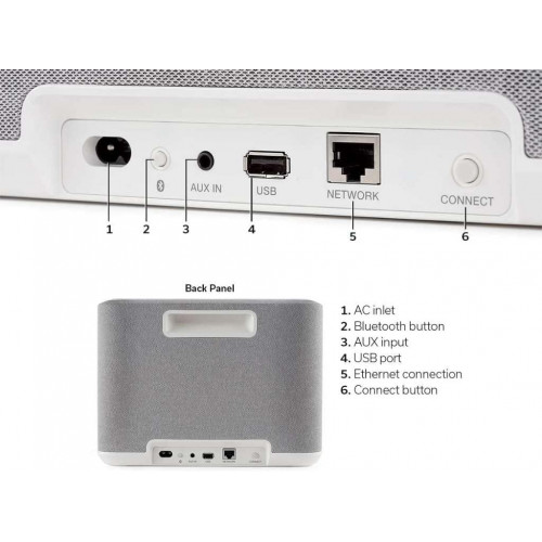 - Para todas tus necesidades musicales: en línea o sin conexión: USB, soporte de red con una amplia gama de conexiones inalámbricas que te permite conectar este altavoz inteligente y elegante a cualquier receptor AV, barra de sonido, reproductor de red o altavoces adicionales para un sonido estéreo increíble