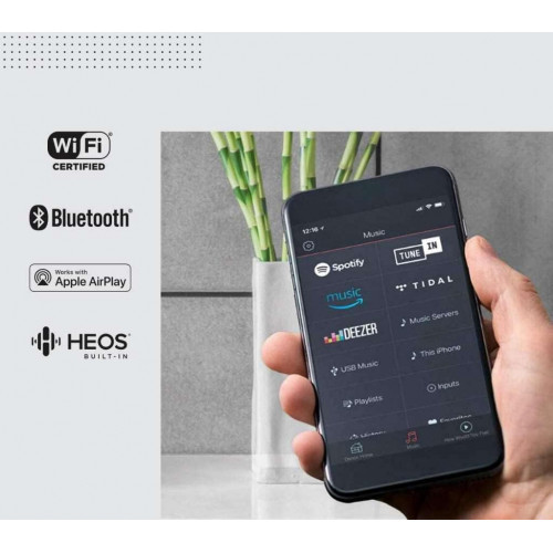 - Transmite tu música favorita desde Spotify, Apple Music, Amazon Music HD, Pandora, TIDAL, TuneIn y más a través de Wi-Fi, AirPlay 2, HEOS o Bluetooth. Disfruta de operaciones manos libres con los comandos de voz de Amazon Alexa desde cualquier dispositivo Echo (se venden por separado)