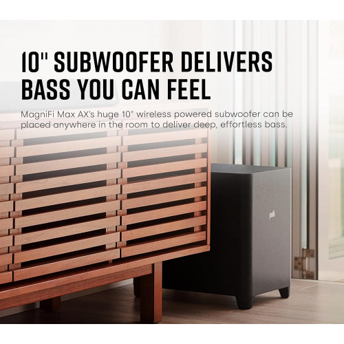 - Sonido con sistema de subwoofer: incluye un potente subwoofer inalámbrico plug-and-play de 10 pulgadas que se conecta instantáneamente a la barra de sonido en el momento en que lo enciendes. Ofrece graves profundos y sin esfuerzo, a niveles de volumen que sorprenden por su tamaño