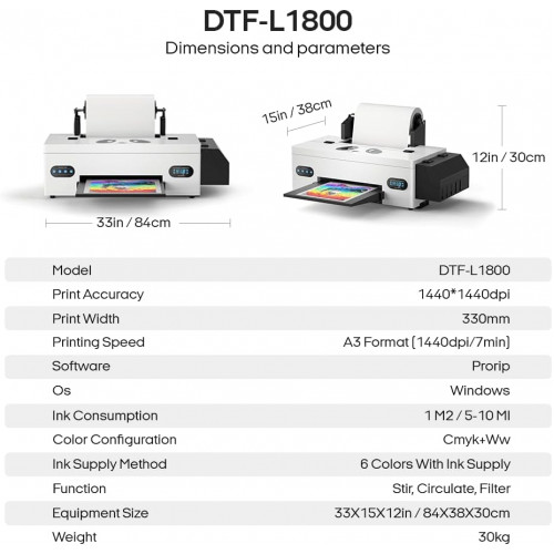 - Nota: Con el fin de evitar daños por fugas de tinta a la impresora, vamos a tinta y polvo embalado como un paquete en un envío por separado juntos. 1 impresora A3 L1800, 1 horno, 5 botellas de tinta blanca CMYK, polvo de goma de 500 g, rollo de película de 30 cm x 100 m, 1 software