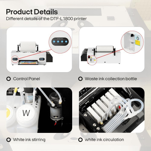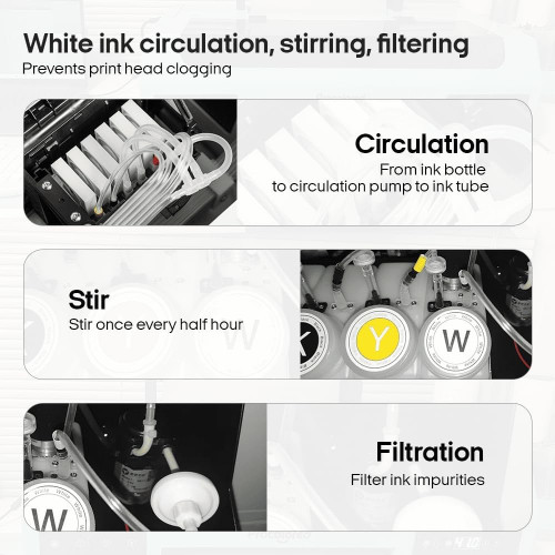 - Sistema avanzado de gestión y mantenimiento de la tinta blanca:Equipado con un avanzado sistema de circulación, agitación y filtración de la tinta blanca, además de un mecanismo de sifón que maximiza la actividad de la tinta y minimiza los riesgos de obstrucción. La limpieza automática cada 10 horas prolonga aún más la vida útil de su equipo de impresión DTF.